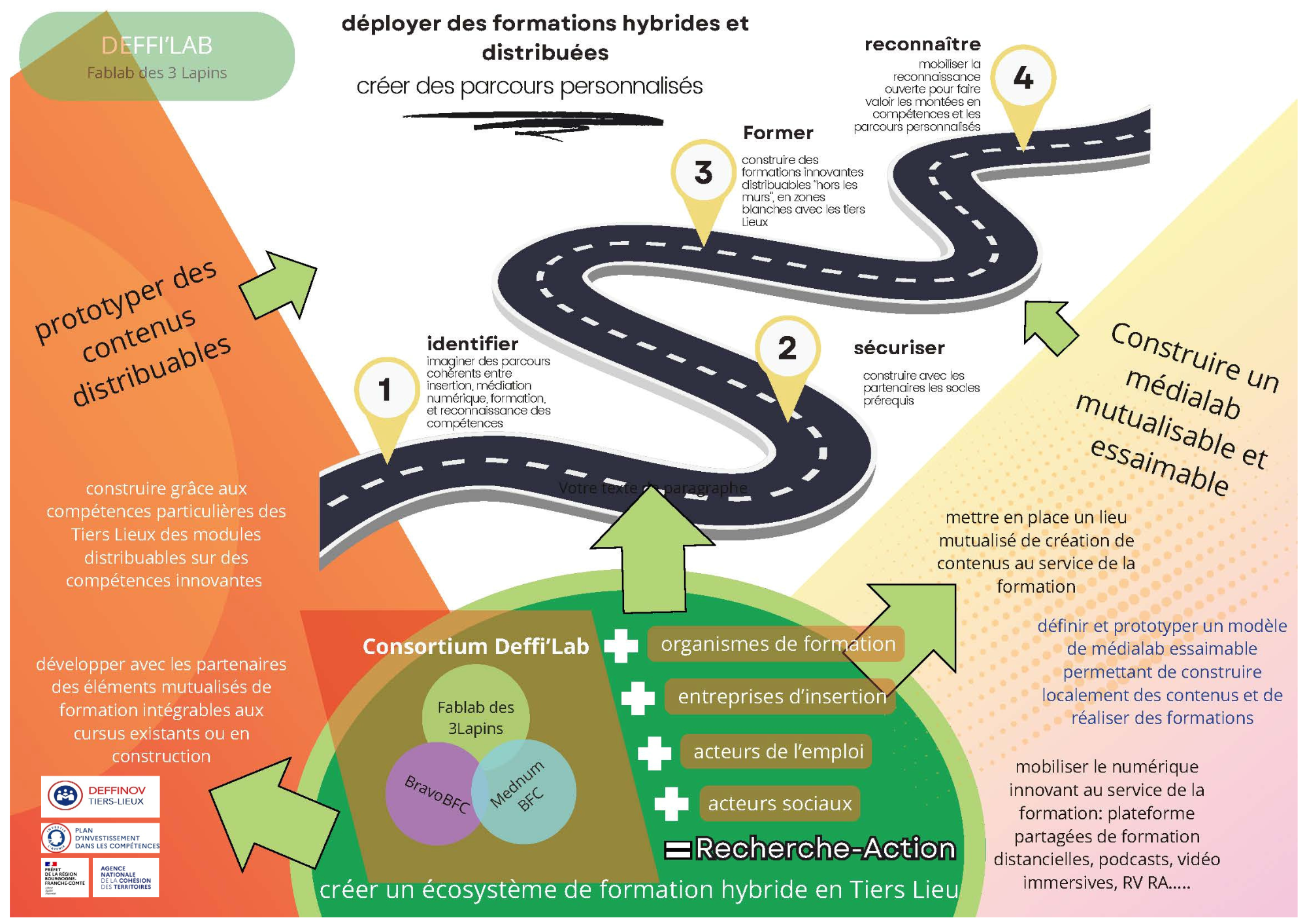 Le projet « DEFFILAB » propose de construire ensemble avec tous ces acteurs un dispositif collaboratif pour imaginer et réaliser des parcours de formation professionnelle permettant à un plus grand nombre encore de nos concitoyens d’accéder à des formations plus près de chez eux, plus souples et plus personnalisées dans leur mise en place, avec un choix plus large de compétences.